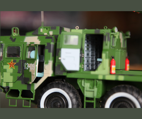 ●300毫米火箭炮-北京軍事仿真模型發(fā)射車車頭可向前45°翻起,部分發(fā)動機(jī)可見;